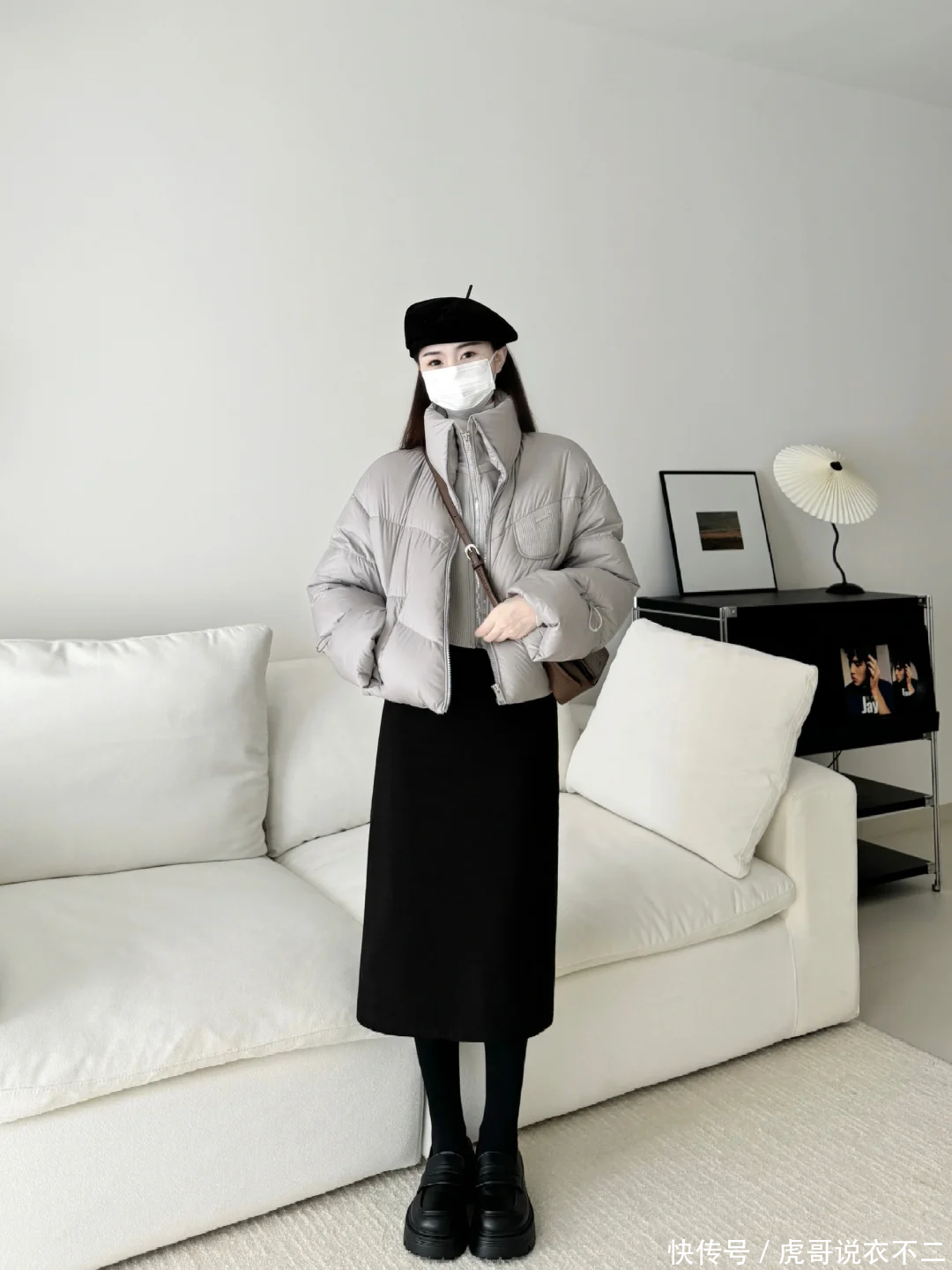 2、短款羽绒服配半身裙:保暖与时尚并存